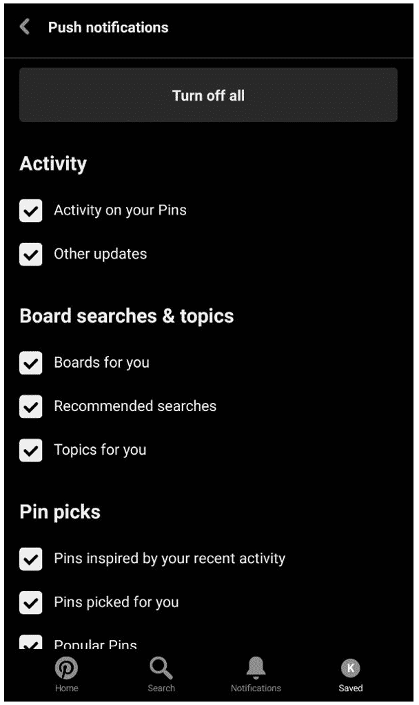 A good example of an app that does this well is Pinterest. Pinterest users can choose whether they want to receive notifications for repins, likes, follows, mentions, comments, messages, or nothing at all.