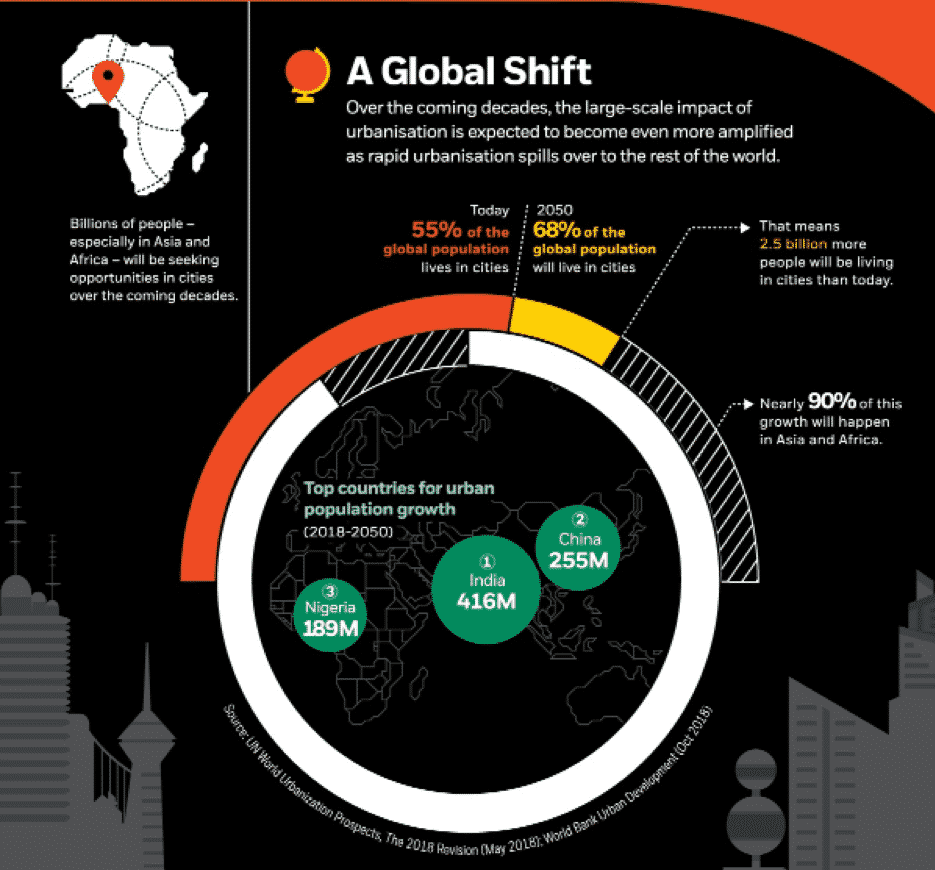 Today, more than half of the world’s population lives in urban areas. According to the United Nations, 55% of the world’s population lived in urban areas in 2018. The UN expects this figure to increase to 68% by 2050.
