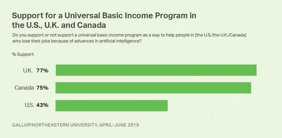 A poll by Gallup found that whereas more than three quarters of UK and Canadian citizens support UBI, only 43% of American citizens support the idea.